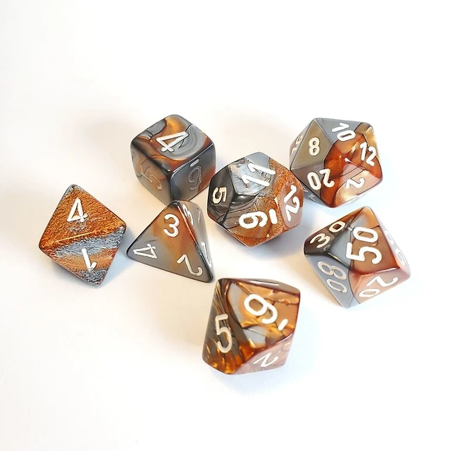 7 dés polyédriques Gemini cuivre/acier avec chiffres blancs