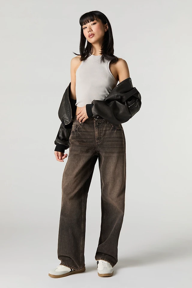 Jean rigide baggy d'aspect usé à taille basse avec poches