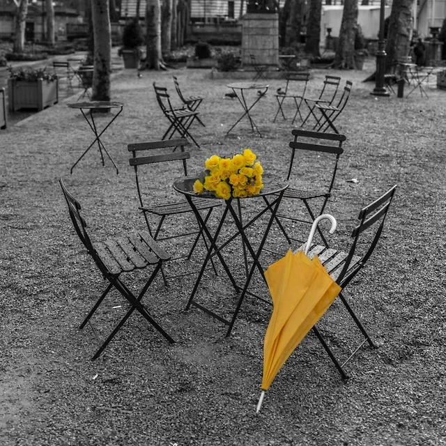 Assaf Frank - Bunch of roses and umbrella on table chair at the park, New York