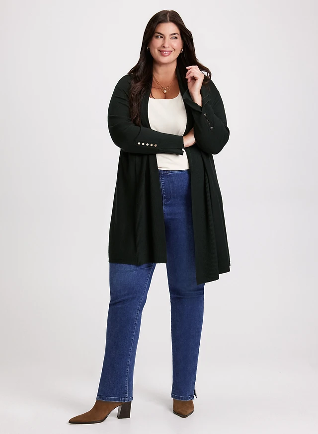 Veste-manteau à motif pied-de-poule et jean à jambe évasée