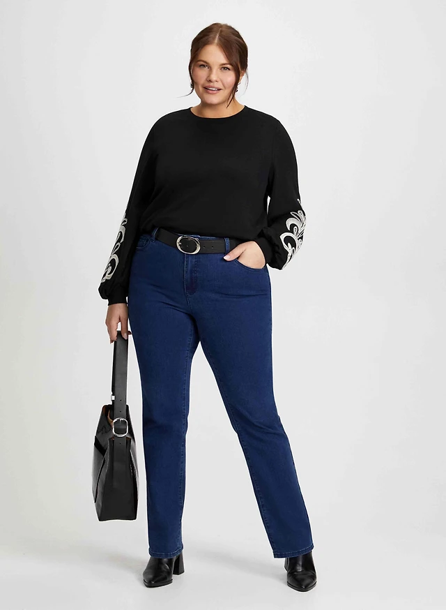 Pull à détails perlés et jean droit à enfiler