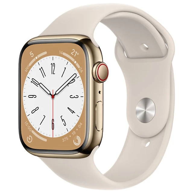 Apple Watch Series 8 (GPS + cellulaire) avec boîtier de 45 mm en acier inoxydable doré et bracelet sport comète par Koodo - Moyen/Grand - Paiement Balance mensuel