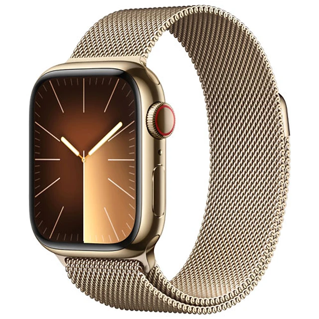 Apple Watch Series 9 (GPS + cellulaire) avec boîtier de 41 mm en acier inoxydable doré et bracelet à rabat milanais acier inoxydable doré par Koodo - Petit - Paiement Balance mensuel