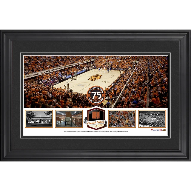 Collage panoramique encadré du 75e anniversaire de la Gallagher-Iba Arena des Cowboys de l'Oklahoma avec ballon de basket utilisé lors du match - Édition limitée à 500 exemplaires