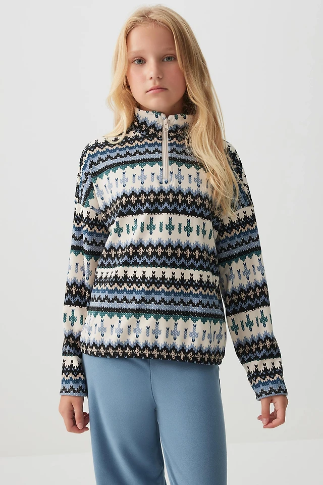 Ardene Kids Fair Isle Polar Fleece 1/4 Zip Sweatshirt in Medium Blue | Size | Polyester/Elastane