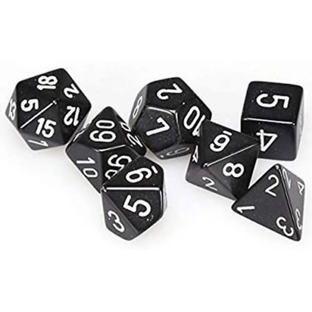 7 dés polyédriques transparents fumée avec chiffres blancs