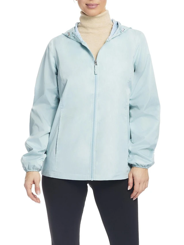 Details Women's Windbreaker Jacket With Gingham Lining Trim Inside of Hood & Yoke