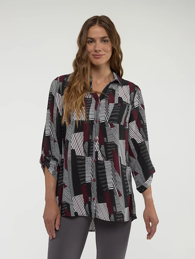 3/4-sleeve semi-fitted tunic length blouse with buttons