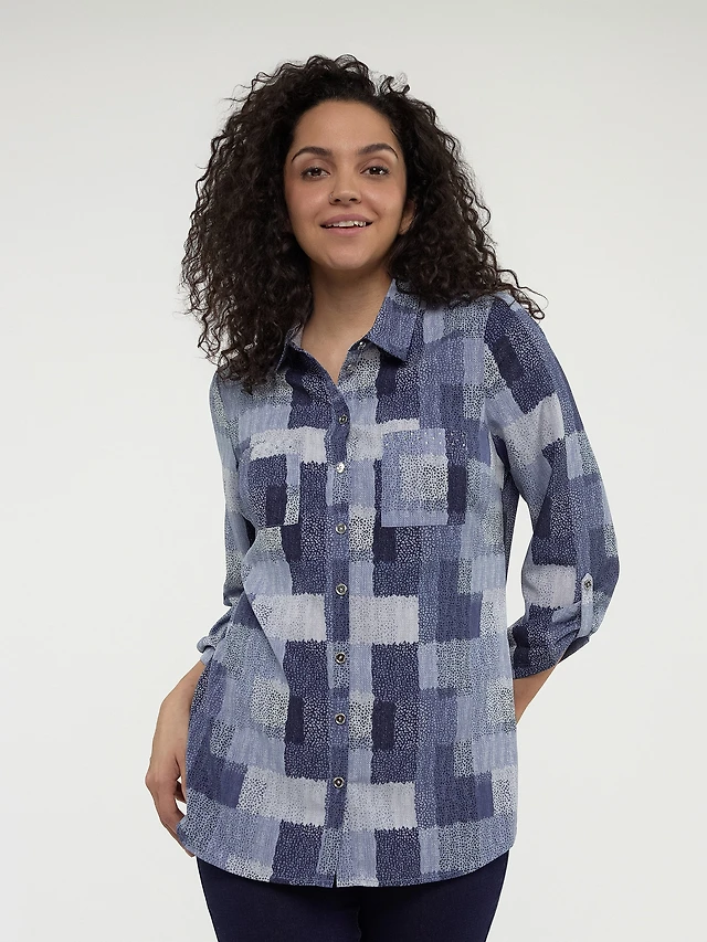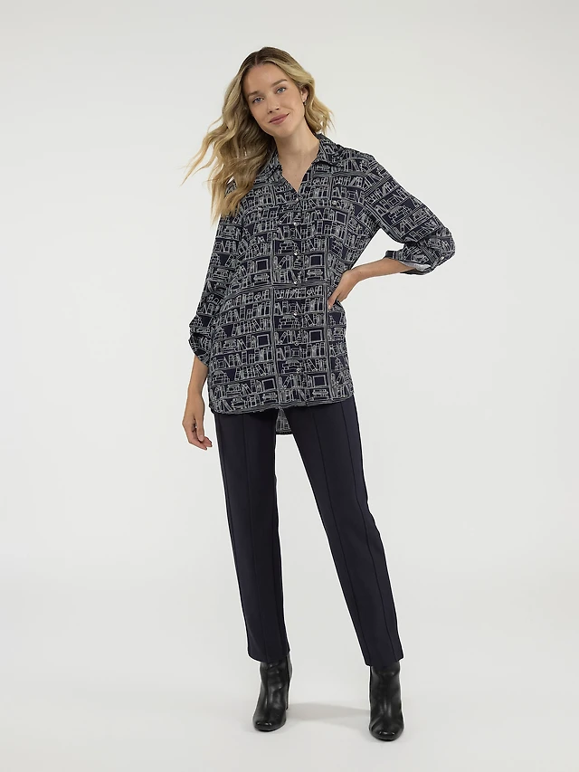 Long-sleeve tunic length blouse with buttons