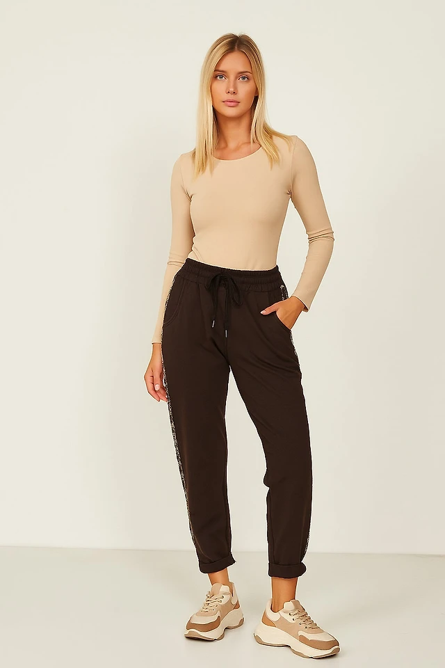 Pants with side rhinestone band leopard print