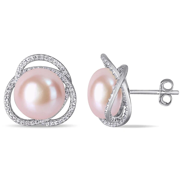 Miabella Pink Freshwater Cultured Pearl and 1-3/5 Carat T.G.W. Cubic Zirconia Sterling Silver Interlaced Stud Earrings