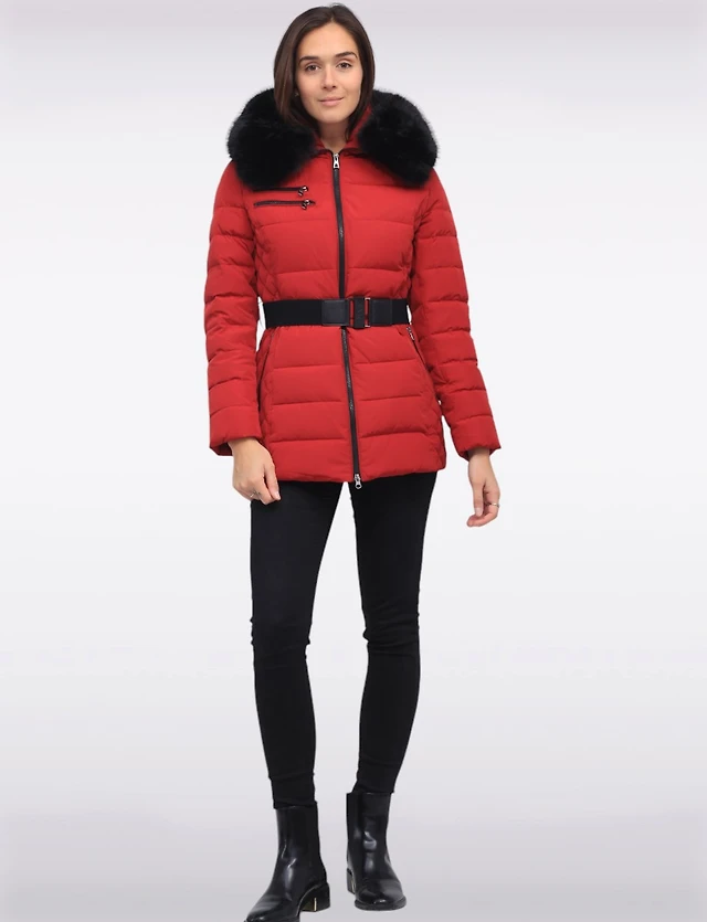 Jennsen Vegan Dual Quilted Polyloft Belted Coat with Faux Fur Trim Hood by Saki
