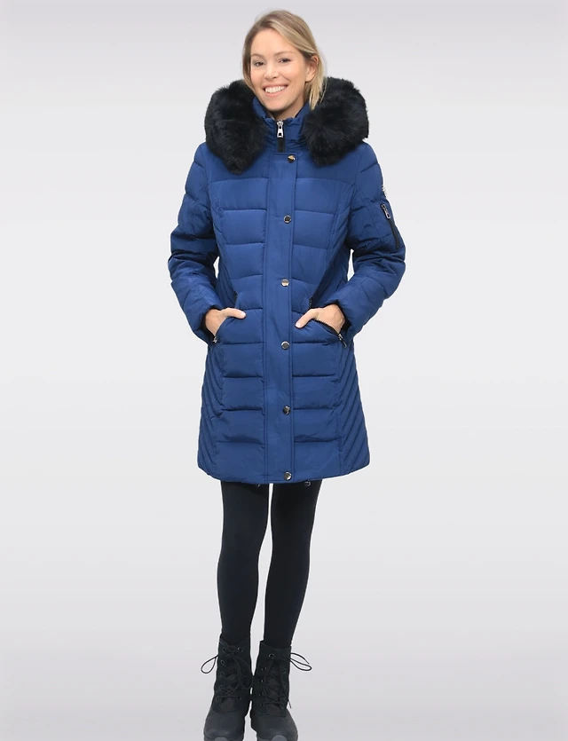 Straight Fit Vegan Smooth Polyloft® Coat Detachable Faux Fur Lined Hood by Saki