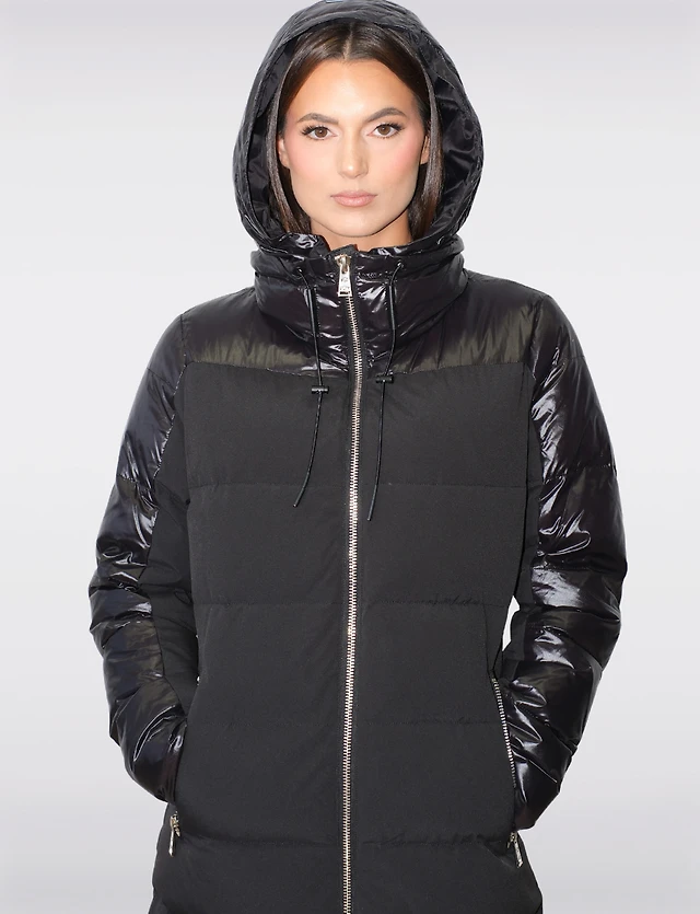 Dual Quilted Fitted Long Down Zip Front Detachable Hood Puffer Jacket by Sicily