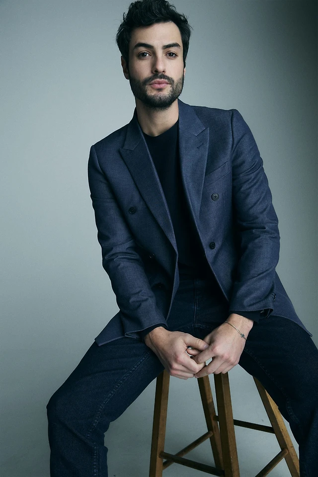 Denim-look double-breasted fitted blazer