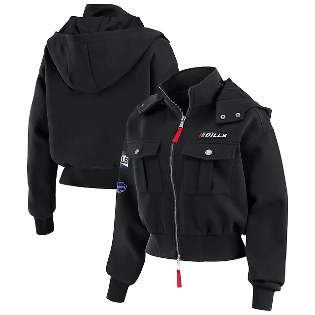 Women's WEAR by Erin Andrews Black Buffalo Bills Tri-Blend Patch Pocket Cropped Full-Zip Bomber Hoodie Jacket