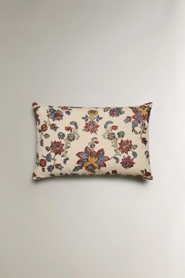 FLORAL THROW PILLOW COVER WITH POMPOMS