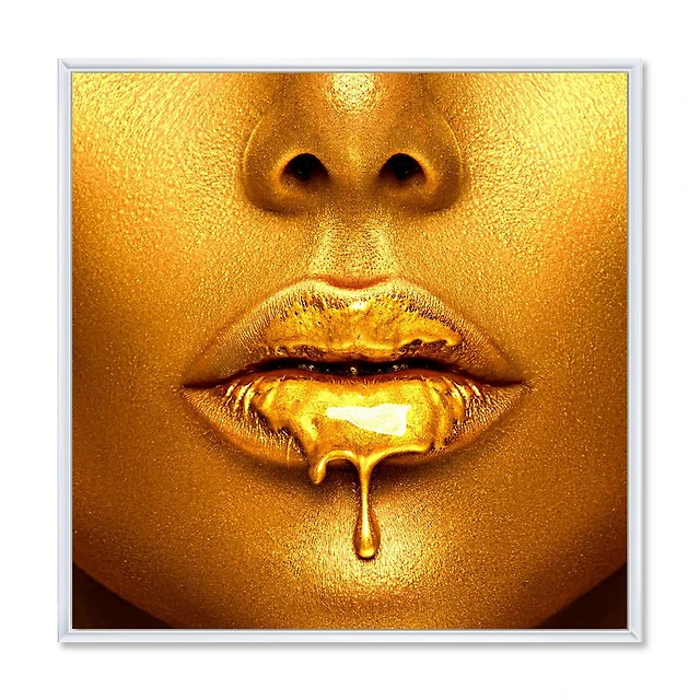 Designart Gold Paint Drips From Sexy Woman Lips FLOAT FRAME WALL ART