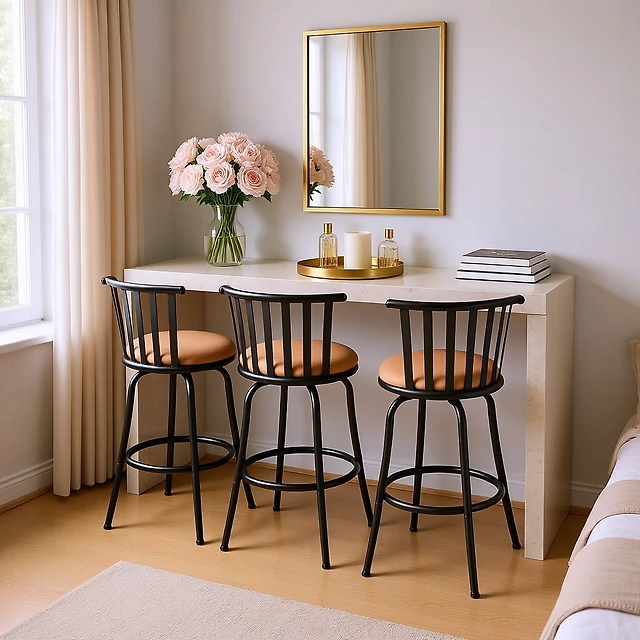 Homy Casa Set of 3 Compact Adjustable Bar Stool for Small Spaces, Swivel Chair with Tan Cushion and Metal Frame