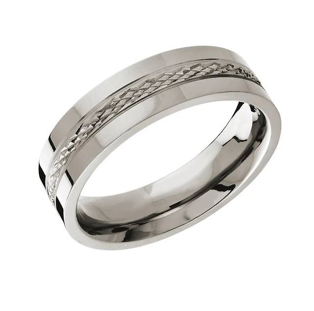 Men's Stainless Steel Ring with Brushed Center and Textured Edges – 6.5mm. Color: silver | Doucet Latendresse