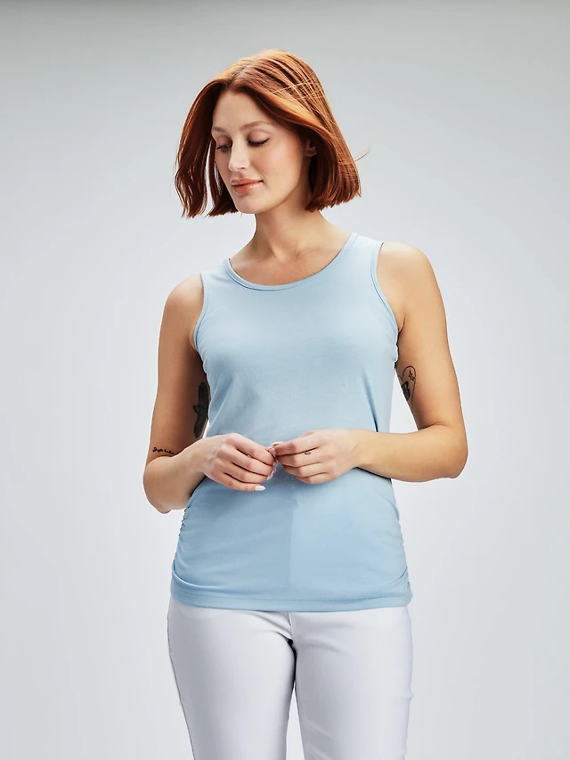 3/4-sleeve semi-fitted tunic length blouse with buttons