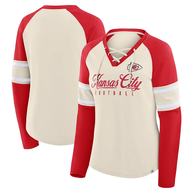 Women's Fanatics Cream/Red Kansas City Chiefs Gridiron Hero Raglan Lace-Up V-Neck Long Sleeve T-Shirt