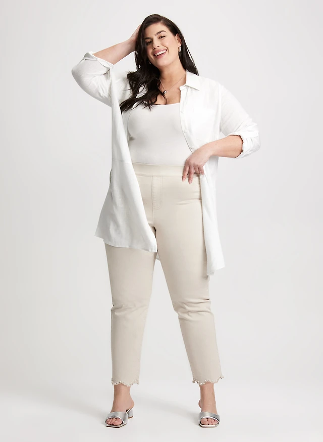 Linen-Blend Button-Down Tunic & Scalloped Hem Straight Leg Jeans