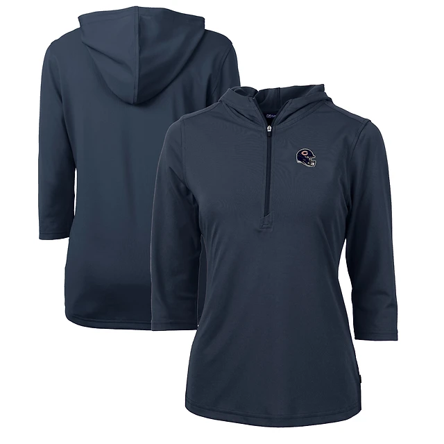 Women's Cutter & Buck Navy Chicago Bears Helmet Logo DryTec Virtue Eco Pique Recycled 3/4-Sleeve Half-Zip Pullover Hoodie