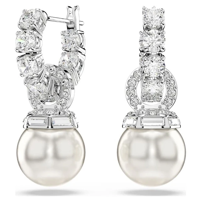 Rhodium Plated Pearl and Crystal Drop Earrings. Color: white | Doucet Latendresse