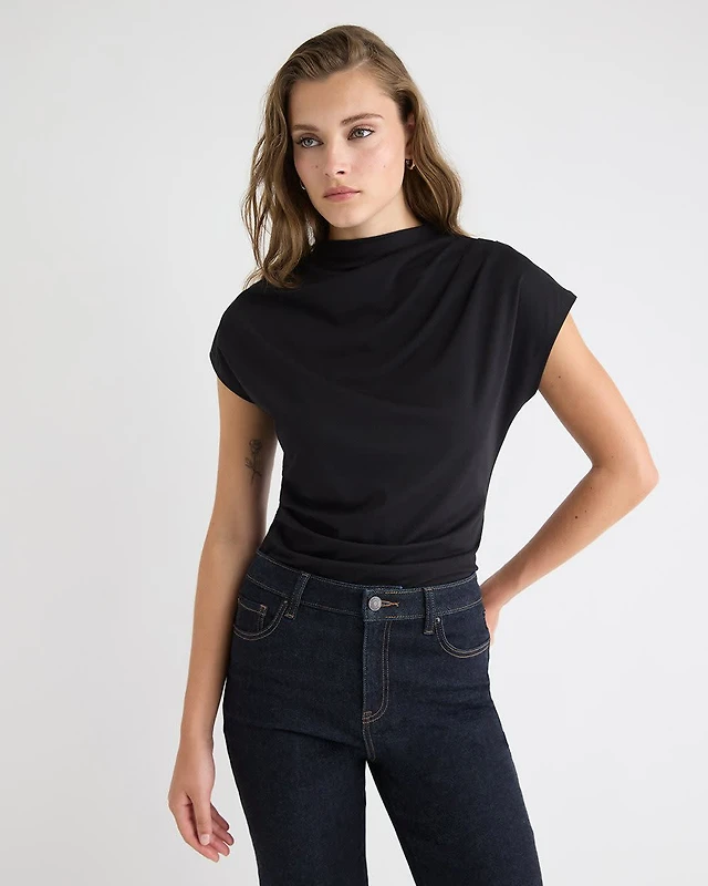Extended-Sleeve Top with Crossover Draped Mock Neckline