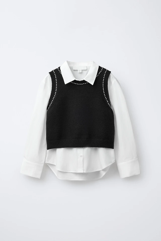 PLAIN SHIRT WITH PEARL KNIT VEST