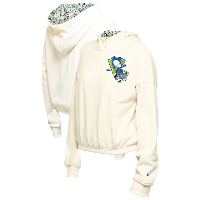 Women's New Era Cream Pittsburgh Penguins Glam Game Quarter-Zip Cropped Floral Hoodie Pullover