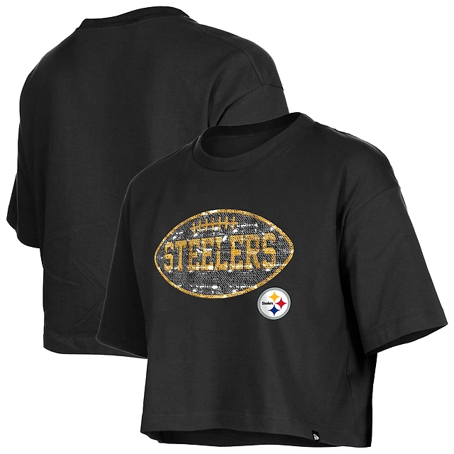 Girl's New Era Black Pittsburgh Steelers Flip Sequin Boxy T-Shirt