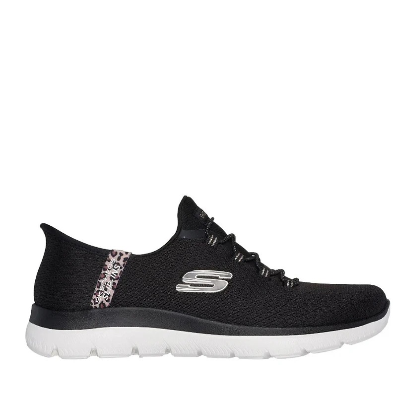 Add a touch of glamour to your step with the Skechers Slip-ins® : Summits - Leopard Chic, combining absolute comfort and effortless style. Designed with our Heel Pillow®, this vegan model features a mesh upper with leopard trim, fixed stretch laces and a comfortable Skechers Air-Cooled Memory Foam® footbed.