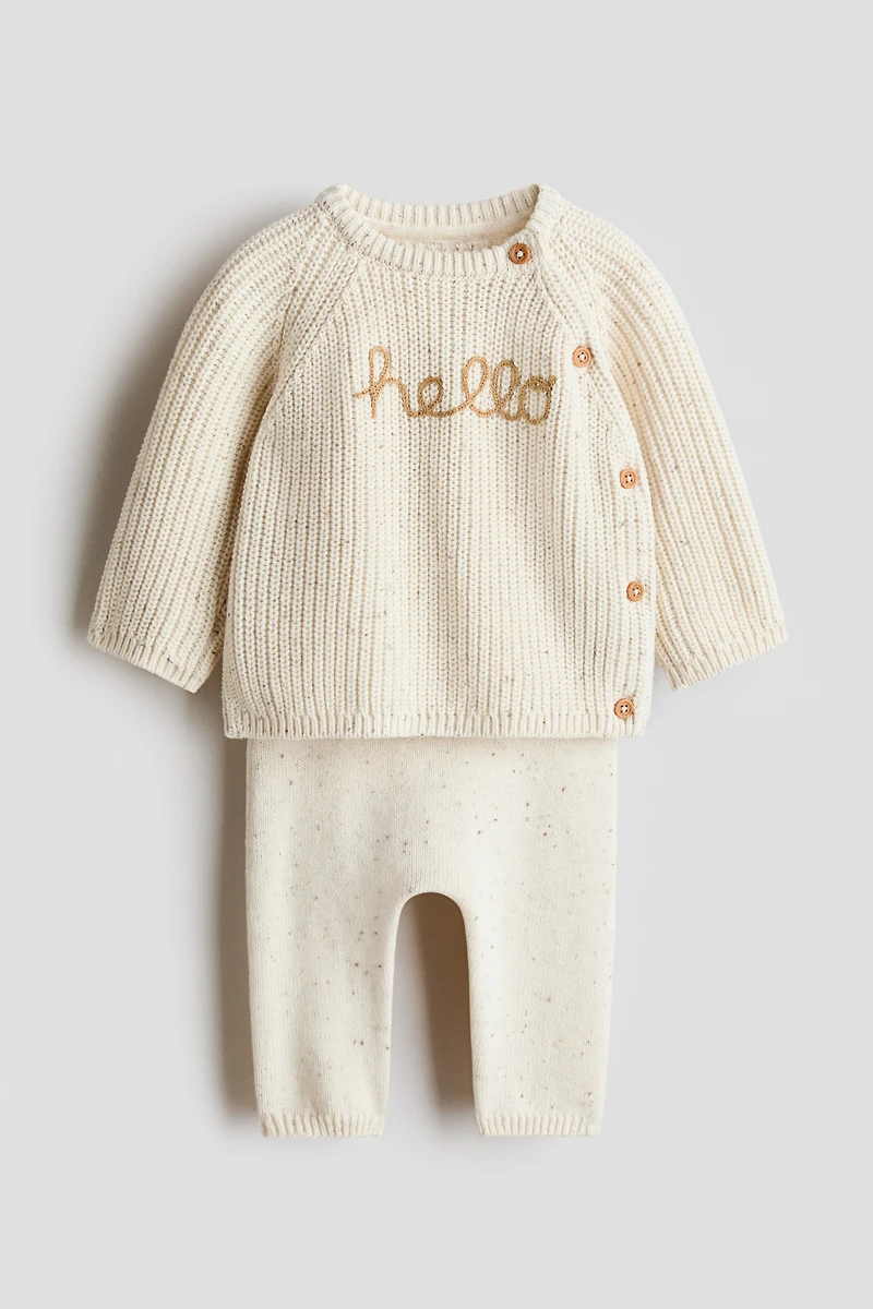 Set in soft, fine-knit cotton with a sweater and pants. Sweater with a jacquard-knit pattern, forward-facing opening at one side with buttons, long raglan sleeves, and ribbing at cuffs and hem. Pants with covered elastic at waistband and ribbed hems.