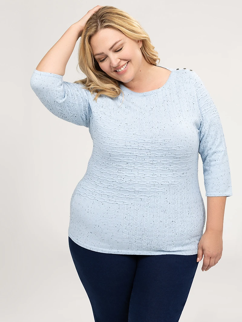 Plus-size sweater with semi-fitted cut, round neckline, three-quarter sleeves and hip length. The knit features various textured patterns on the front and a speckled effect across the fabric.