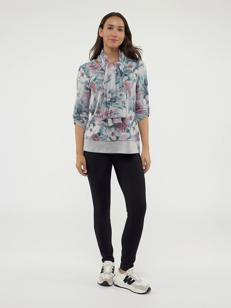 This top combines a trompe-l'œil neckline, a detachable scarf, and a delicate floral print for a feminine and creative look. The 3/4 sleeves, adjustable with buttons, offer a casual yet refined vibe.