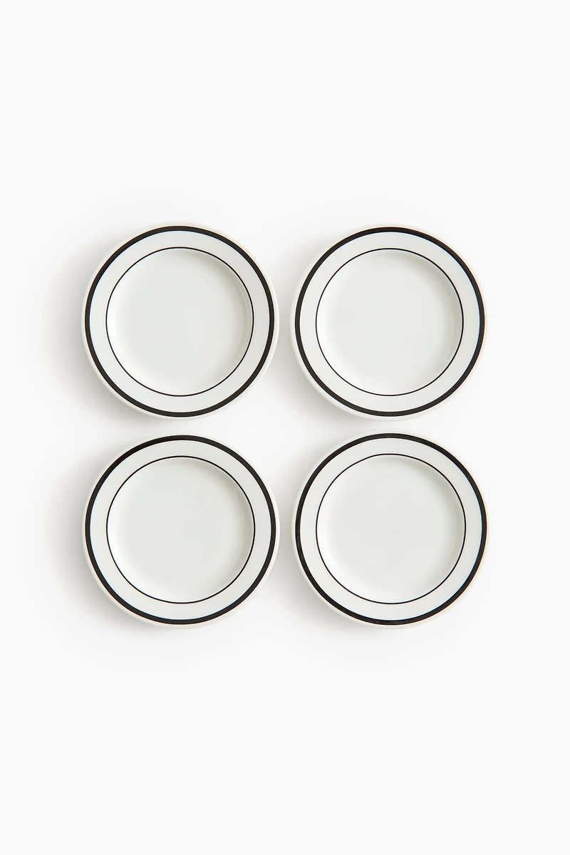 Four side plates in porcelain with a classic painted rim inspired by cozy French bistros.