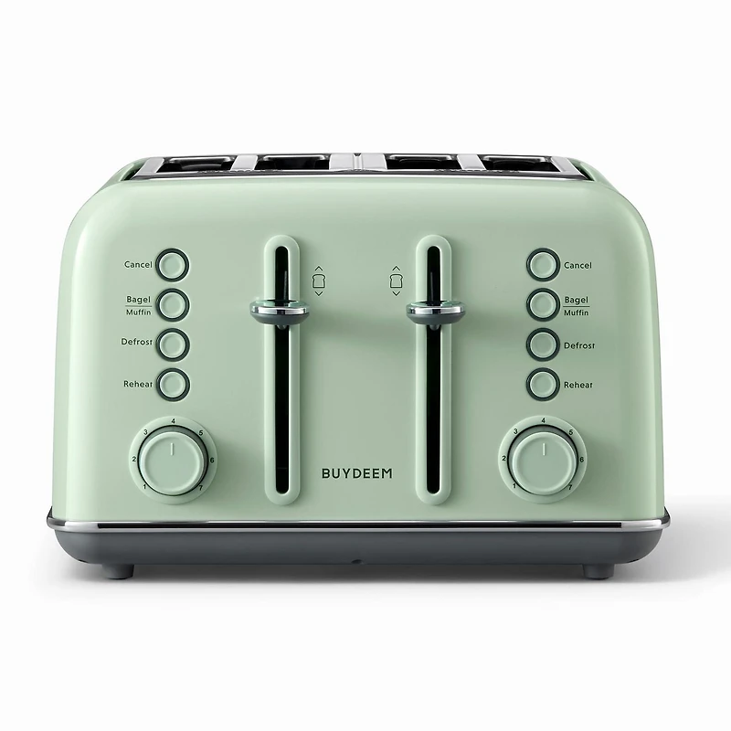 Designed for efficiency and functionality, this 10-setting toaster is a must-have kitchen essential that reheats, defrosts, toasts bread, toasts the cut sides of bagels and more. With its pastel, vintage-style green exterior and dual control panels, this toaster will not only look great on your countertop — but toast to perfection. Bagel setting warms both sides of the bagel slightly, then toasts just the cut sides. Defrost setting thaws frozen bread, frozen waffles, etc.Reheat setting warms items without browning or toasting. Removable crumb trays slide out for easy cleaning and less mess. Extra-long, 40-inch cord is ideal for smaller kitchens with limited counter space. Extra lift control lever gives you an added boost for easy removal. LED light indicators help you see which mode you’ve selected.