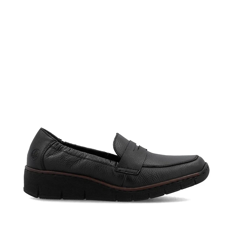 A timeless favorite!These black Rieker moccasins in smooth leather seduce with their classic design and great comfort. This shoe has been manufactured using the traditional stitchdown technique, which gives it great sturdiness and flexibility. The elastic band makes them easy to put on. The lightweight, shock-absorbing sole with wedge heel ensures a pleasant walking sensation. In addition, the extra-soft insole provides extra comfort. The slim fit provides extra support. We couldn't ask for more!