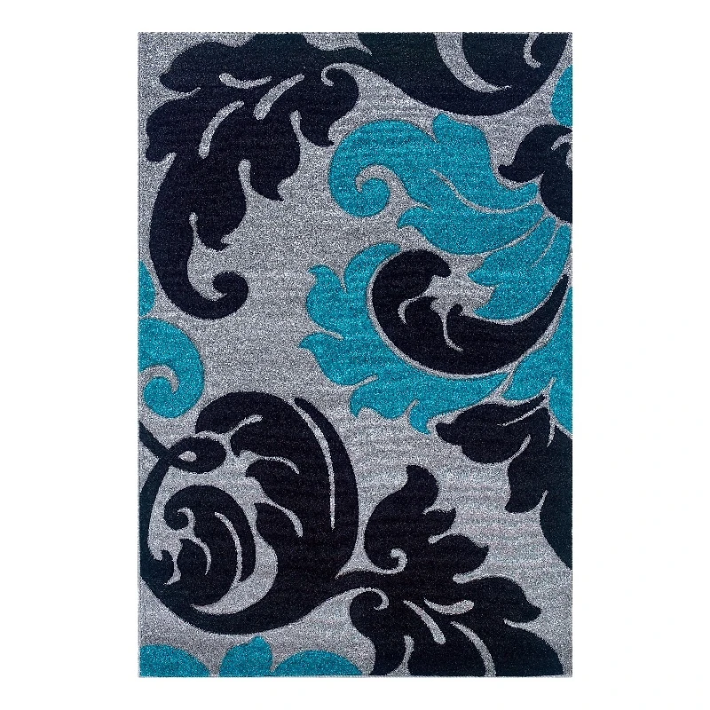 The Corfu Collection, created in Turkey, is Power loomed from 100% Heat Set Frieze Yarn. Featuring hand-carved details, the Corfu Collection has bright colored patterns. The perfect addition to any contemporary or modern designed homes or any kids room. Corfu comes in a variety of sizes perfect for any area, 1.10 x 2.10, 5 x 7.7 and 8 x 10.3. In addition, the two floral patterns are offered in a 3 x 5 size, making them the perfect addition to your child's room.Features : Crafted from 100% Heat Set Frieze Yarn PileAction BackingMachine MadeGrey and TurquoiseContains Latex8' X 10'3" is perfect for larger rooms or defining spaces in open conceptsBlack and Grey pair perfectly with a pop of TurquoiseOverscaled swirling pattern reminiscent of a fern or feather floatingSerged edges provide a clean finishVacuum regularly. Spot clean with damp cloth and mild detergent. Professional cleaning recommended.Frieze yarns add extra texture and visual interestPolypropylene makes for quick and easy careA rug pad (not included) is recommended to prevent slippingRugs may contain temporary creases upon arrival, allow time for creases to flatten and settleSpecifications : Product Dimensions : 8' x 10'3"Product Weight : 39 lbsWarranty : 30 Day Limited