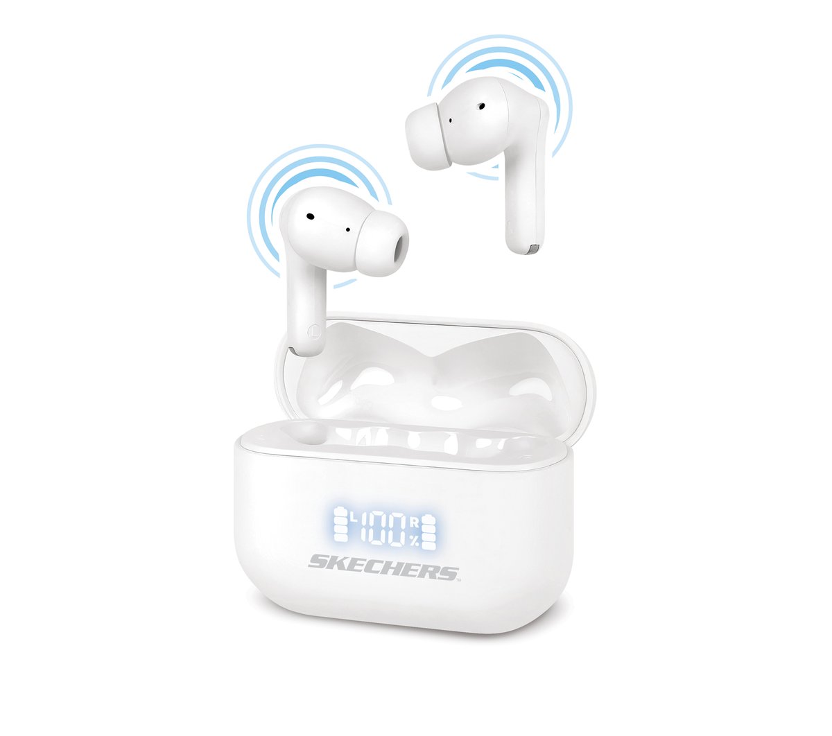Experience clear sound with no-strings-attached comfort wearing Skechers Wireless Earbuds. This high-definition Bluetooth set features active noise-canceling technology to help keep unwanted noises out and comfort eartips in multiple sizes for your perfect fit. Includes a pocket-sized charging case with a digital battery display.