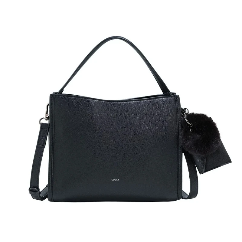 A compact top-handle shoulder bag with a vegan fur scrunchie and a card holder for its ornaments.