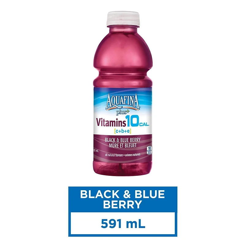 Aquafina Plus+ Vitamins 10 Cal.™ Vitamin Enhanced Water Beverage Black and Blue Berry is a refreshing drink with only 10 calories per bottle. Enriched with antioxidant vitamins C and E and a source of B vitamins, it helps support your daily wellness. Enjoy the delicious berry flavor in every sip. This 591mL bottle is perfect for staying hydrated on the go, whether at work, the gym, or during daily activities.
