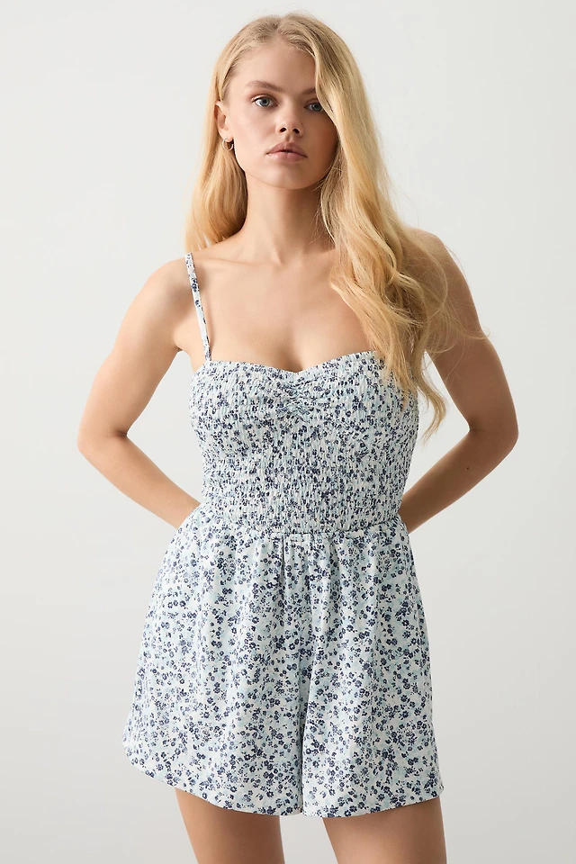 Ardene Floral Smocked Bodice Romper in Light Blue | Size | Polyester/Spandex
