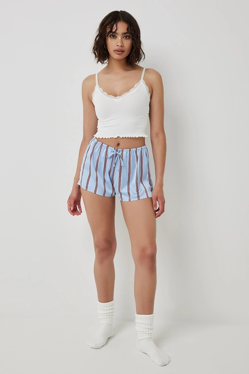 Exclusive piece from our Rose + Vine loungewear collection. Eco-conscious satin pyjama shorts. Elastic waist 66% polyester, 30% recycled polyester, 4% spandex For XS/S, select SFor L/XL, select LRecycled polyester fibers are made of post-consumer plastic. | Ardene Printed Satin PJ Shorts in Light Blue | Size Small | Polyester/Spandex | Eco-Conscious