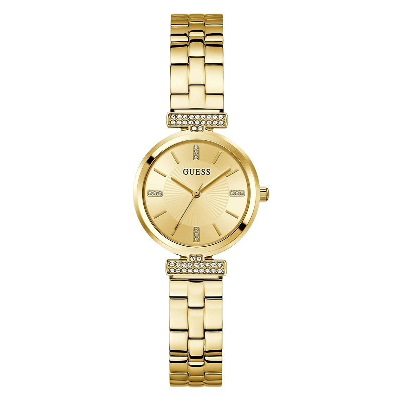 The Guess Array 32?mm analog watch embodies refined elegance with its sleek gold-tone case and bracelet. Its smooth dial is enhanced by minimalist indexes and sparkling crystal accents, creating a luminous and sophisticated look.