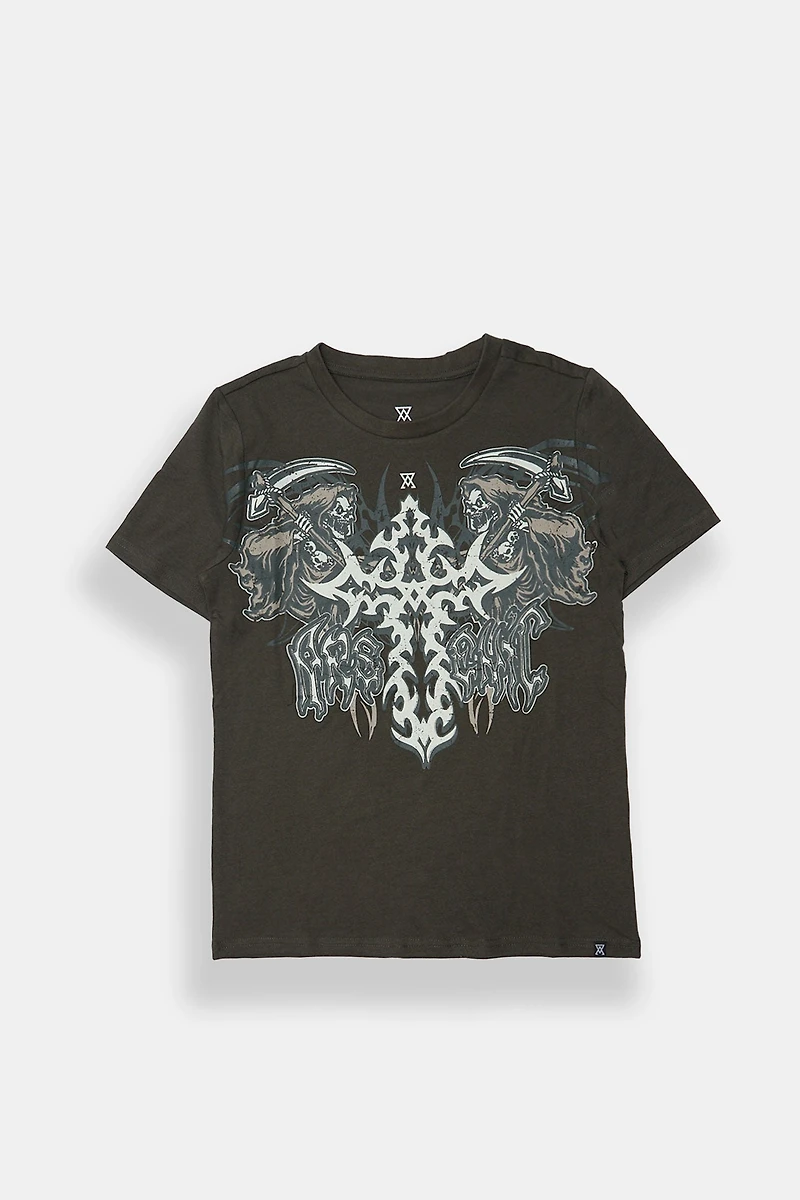 T-shirt with an Arsenic reaper cross graphic printed on the chestWoven brand label on the bottom hemCrew neckRegular fit60% Cotton, 40% PolyesterMachine wash inside out in cold water - Gentle with like colours - No bleach - Tumble dry low - Low iron on reverse sideImported by ArsenicStyle #2750-40912610