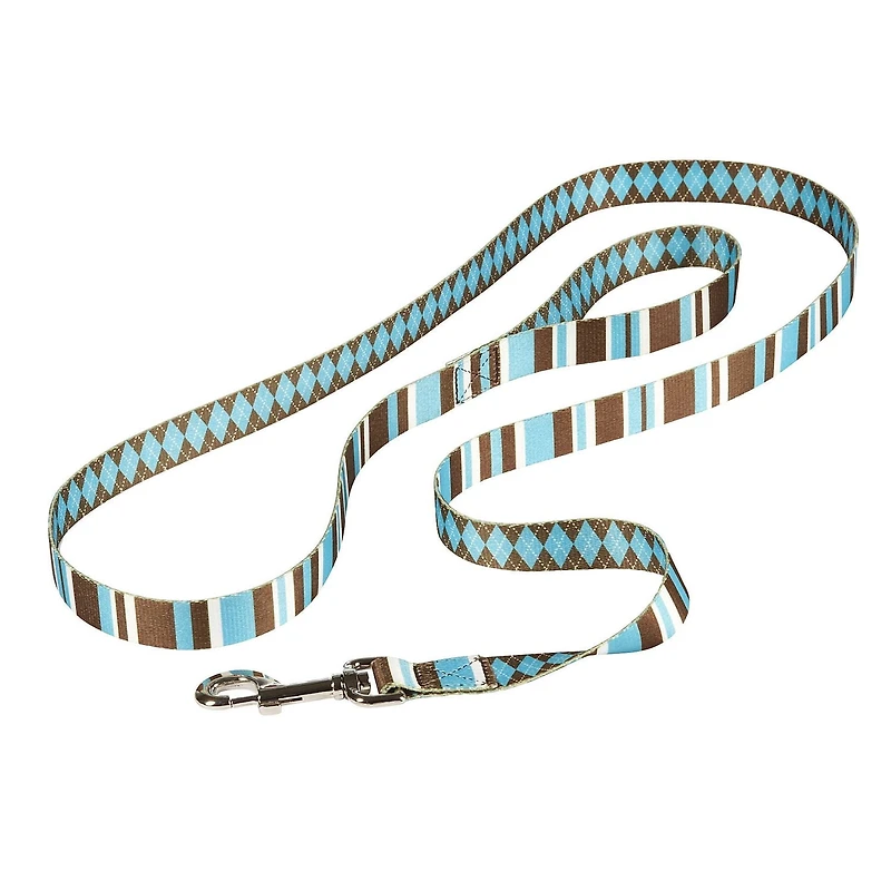 Sturdy braided nylon resists fading and fraying. Rust-resistant nickel-plated hardware. 1" wide (25mm). 6' (1.8m) long. Double-sided print of brown/blue/white stripes and blue diamonds on brown background.