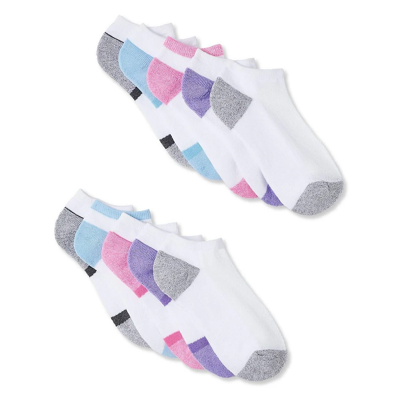 Upgrade your top drawer options with Athletic Works women's low cut socks 10-pack. Composed of a stretch jersey knit, they're styled with a mesh top for breathability, a cushioned sole for comfort, and a reinforced toe for durability. They're available in assorted colours and patterns and fit shoe sizes 4-10.